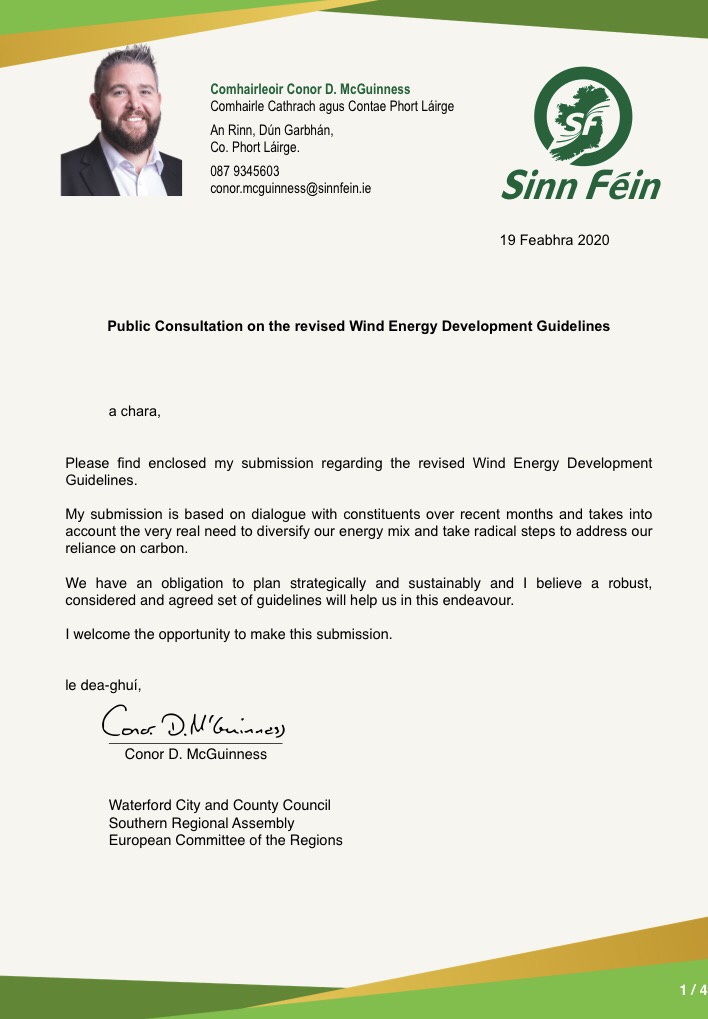 Sinn Féin Councillor Conor D. McGuinness has published his submission on the Government’s revised Wind Energy Development Guidelines, which were subject to a public consultation over recent weeks.