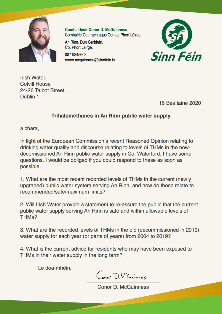 Sinn Féin Councillor Conor D. McGuinness has said that serious questions remain over the health impacts of the decomissioned public water supply serving An Rinn, which was finally replaced last year. He raised concerns following a stark warning from the European Commission to the Irish Government over unsafe levels of trihalomethanes (THMs) in public water supplies.