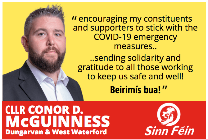 20 June 2021 Sinn Féin’s representative for West Waterford Cllr. Conor D. McGuinness has commented on the emerging situation in the area and has appealed for people to double down on the basic public health precautions. He also called on the HSE to open a test centre in Dungarvan to help address the situation locally.ContinueContinue reading “McGuinness comments on emerging Covid Situation in West Waterford”