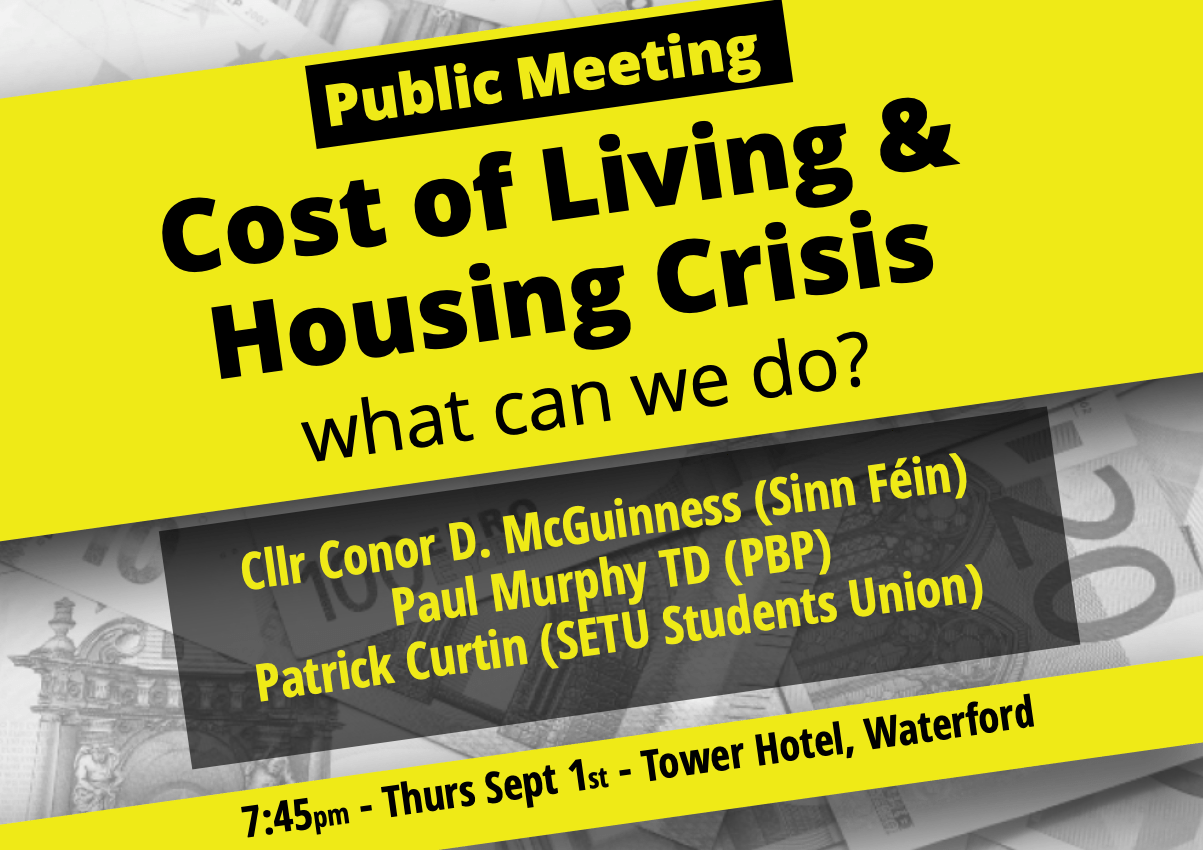Sinn Féin Councillor Conor D. McGuinness is set to address a public meeting hosted by the Cost of Living Coalition Waterford. The meeting takes place at 7:45 on Thursday 1st September in the Tower Hotel. The Cost of Living coalition has been established to campaign for measures to ease the burden of spiralling costs thatContinueContinue reading “McGuinness to address Cost of Living Coaltion meeting in Waterford”
